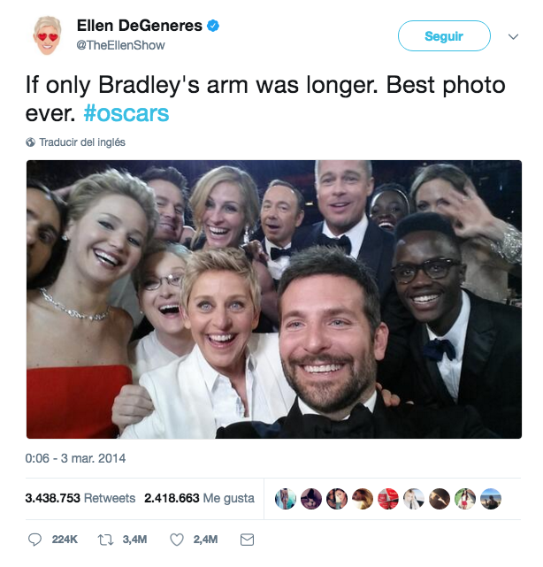 Otro ejemplo de viralidad, en este caso, en las redes sociales, fue el ya conocido selfie de la gala de Los Oscar de 2014. La presentadora Elle Degeners subió un tweet acompañado de una foto de la gala en directo acompañada de varios actores. Este tweet se ha convertido en el tweet con más retweet hasta ese momento.